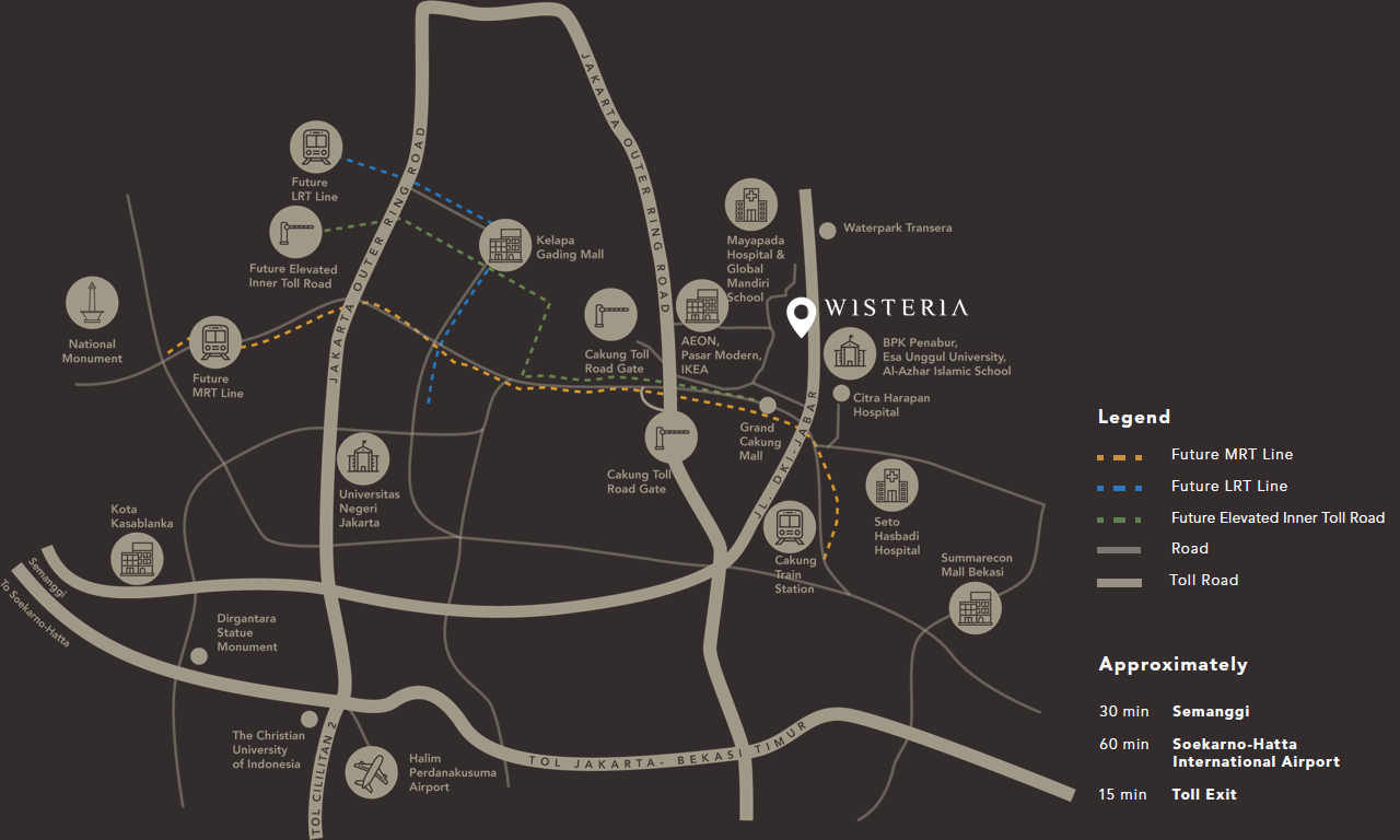 Terletak di jantung Jakarta Timur, Wisteria berada di lokasi utama seluas 7 hektar dan menawarkan konektivitas yang tak tertandingi. Berlokasi strategis, hanya beberapa menit dari gerbang tol, AEON Mall, Jakarta Garden City, IKEA, sekolah dan rumah akit. Di masa depan, ini akan ditingkatkan dengan pembangunan Jakarta Mass Rapid Transit (MRT) yang sedang berlangsung dan jalan tol yang ditinggikan. Wisteria lebih dari sekedar rumah - Rasakan spektrum penuh penawaran yang dirancang khusus untuk Anda dan keluarga Anda.